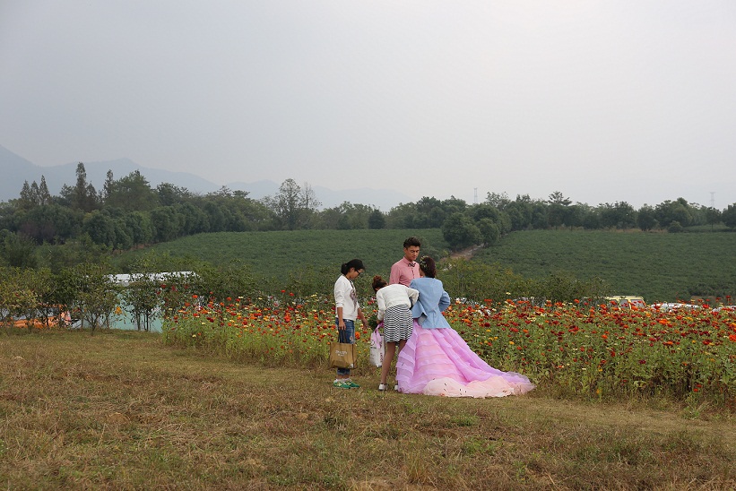 在郁金香高地拍摄婚纱照的新人...