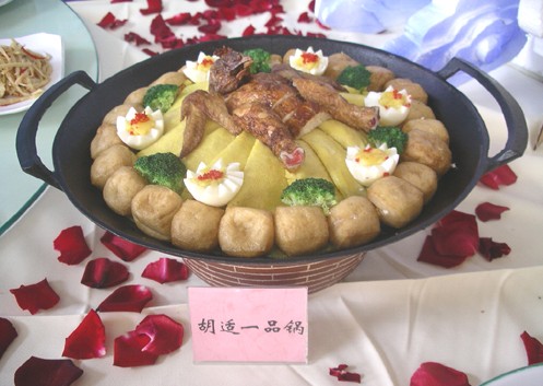 徽菜是指徽州菜,它起源于黄山麓下的歙县(古徽州)。后来,由于新安江畔的屯溪小镇成为"祁红"、"屯绿"等名茶和徽墨、歙砚等土特产品的集散中心,商业兴起,饮食业发达,徽菜也随之转移到了屯溪,并得到了进一步发展。徽菜以烹制山珍野味而著称。