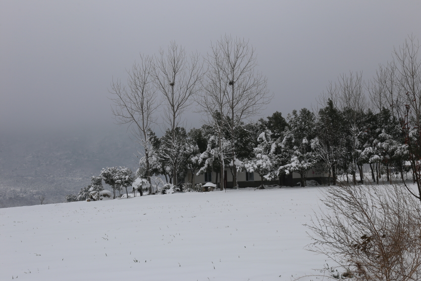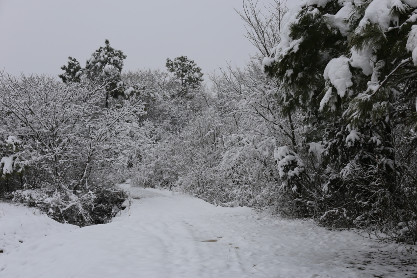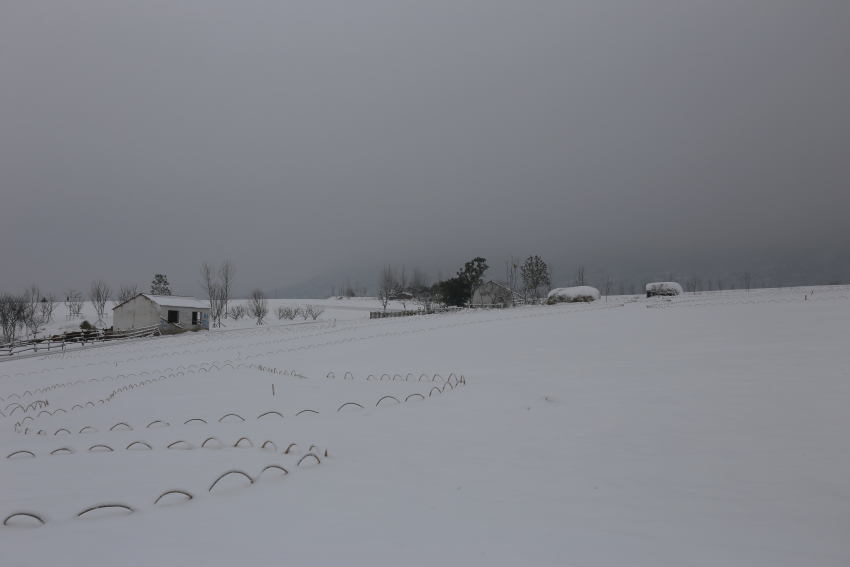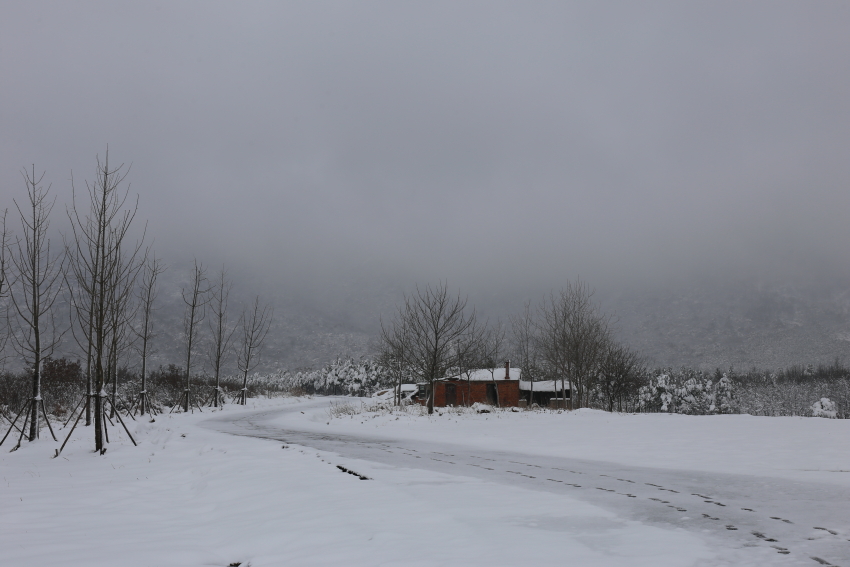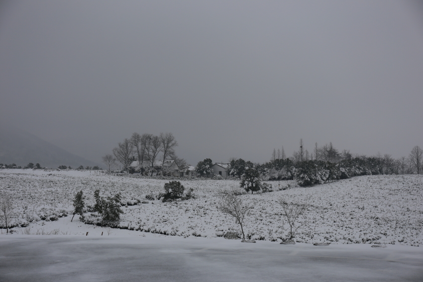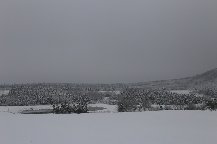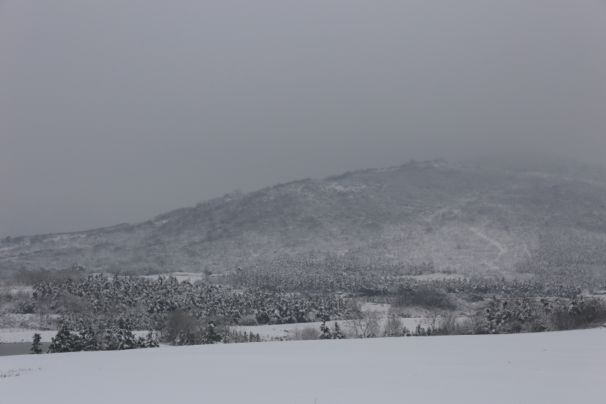 连绵三日大雪后,郁金香高地被装点成了一个冰雪的幻境。无垠的白雪与灰白色天空连成一片,时而让人想起《冰雪奇缘》中的瑰丽王国,时而又想起《情书》中藤井树遥遥地呼唤;峰回路转后有种“千山鸟飞绝,万径人踪灭”的旷远,猛然四顾又有种《智取威虎山》中林海雪原的壮阔。行于其中可见“闻声数点寒鸦起,远村近舍犬皆惊”之景,自有不同于城市的山野之趣。
