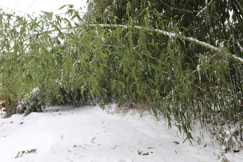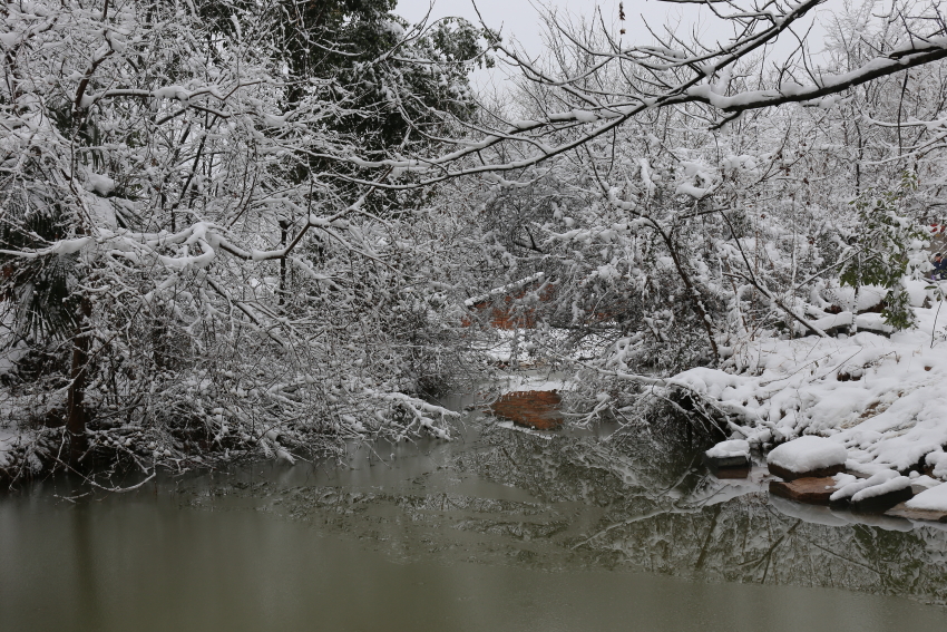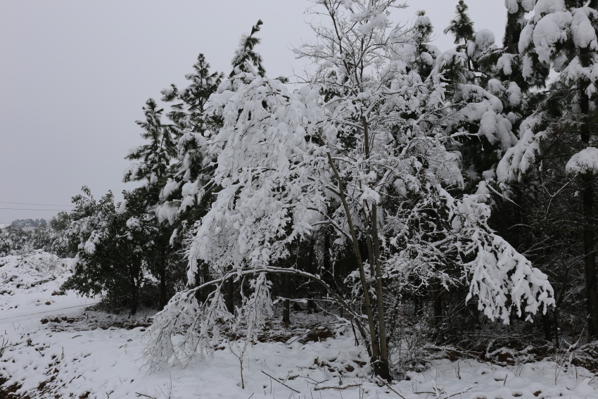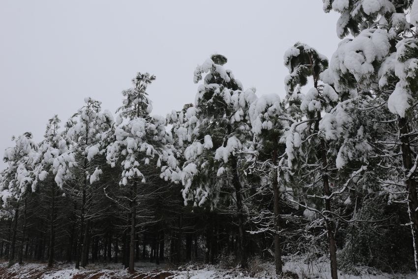 冰雪覆盖下,松树恰如披蓑而立的老人,悄然闲谈
