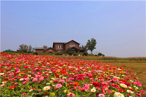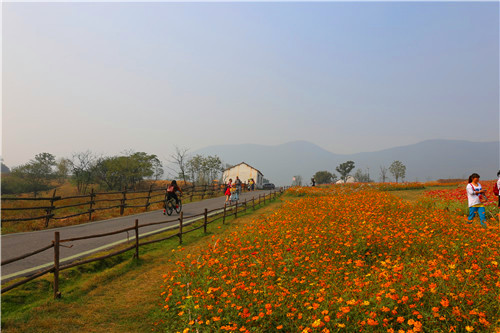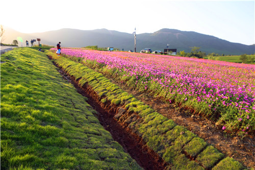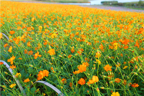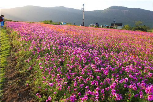 秋风徐来,郁金香高地上硫华菊、波斯菊、百日草迎风盛开,那满山遍野的花朵优雅地绽开着,像一张张美丽的笑脸,送来阵阵浓郁的清香,托起了一个迷人的秋天。