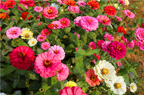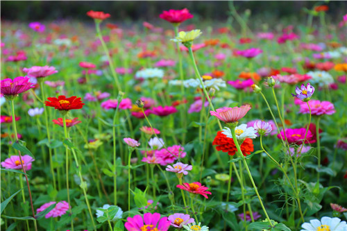 大片大片的花朵竞相开放,争奇斗艳。它们的颜色五彩缤纷、姹紫嫣红,有红的,黄的,白的,粉的;红的似火,黄的塞金,白的如雪,粉的若霞……
